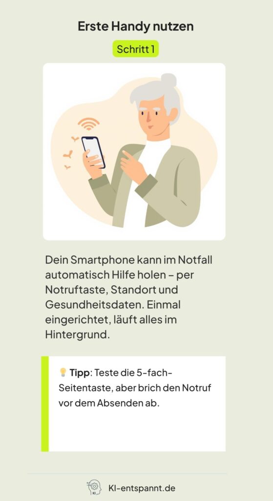Dein Smartphone kann schon heute viel: Es löst einen Notruf aus, teilt deinen Standort und speichert wichtige Gesundheitsdaten. Diese Funktionen musst du einmalig einrichten – danach laufen sie automatisch.