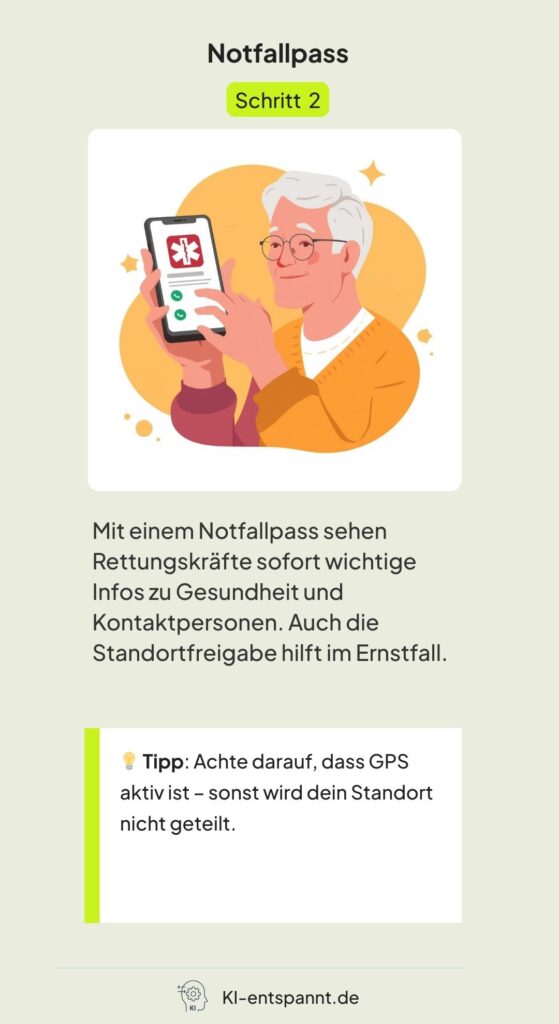 Im Notfall zählt jede Sekunde. Mit einem Notfallpass und der Standortfreigabe wissen Rettungskräfte und Angehörige sofort, wo du bist und welche Hilfe du brauchst.