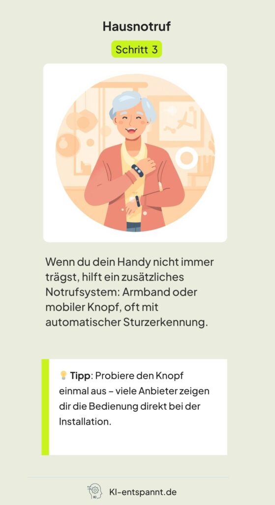 Probiere aus, wie du den Notrufknopf bedienst. Viele Anbieter zeigen dir das direkt bei der Installation.