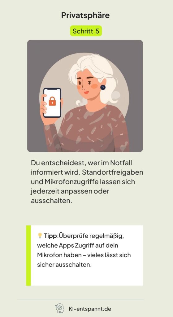 Ob Handy oder Notrufsystem – du entscheidest, wer deine Daten sehen darf. Die Systeme teilen deinen Standort nur im Notfall oder mit Personen, die du auswählst. Sprachverlauf: Bei Sprachassistenten wie Siri oder Google Assistant kannst du alte Sprachbefehle löschen. So bleibt dein Verlauf privat. Mikrofon: Du kannst jederzeit festlegen, ob dein Gerät ständig „mithört“ oder nur bei Aktivierung reagiert.