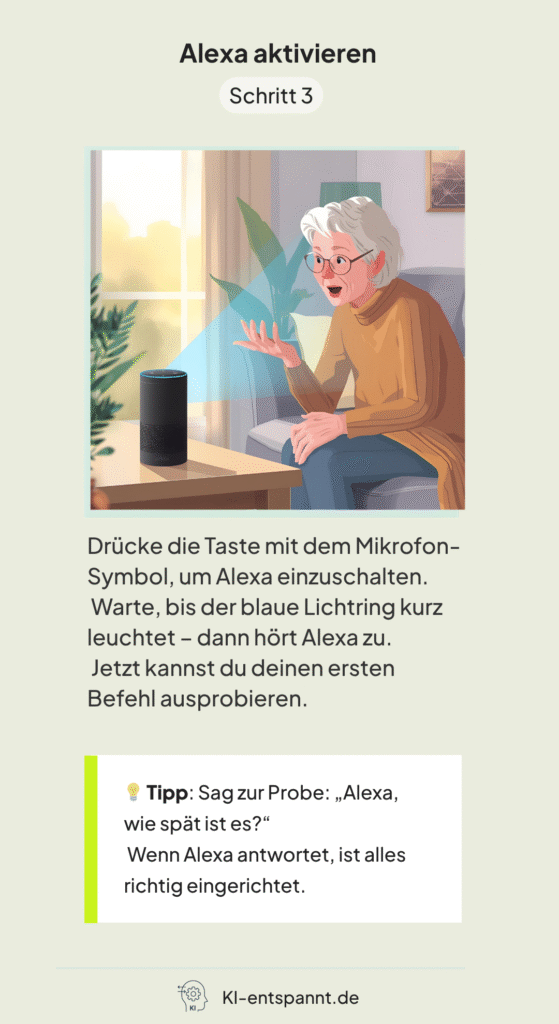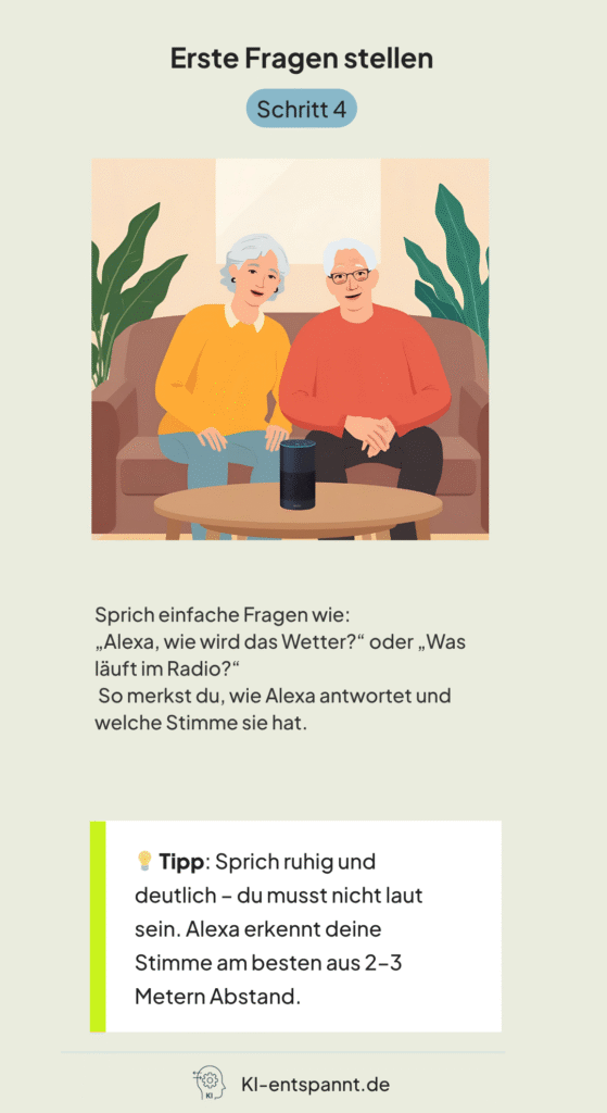 Alexa ist wie ein kleiner, schlauer Lautsprecher. Sie hat ein Mikrofon, damit sie dich verstehen kann. Du sprichst mit ihr, und sie antwortet dir.Platzierung